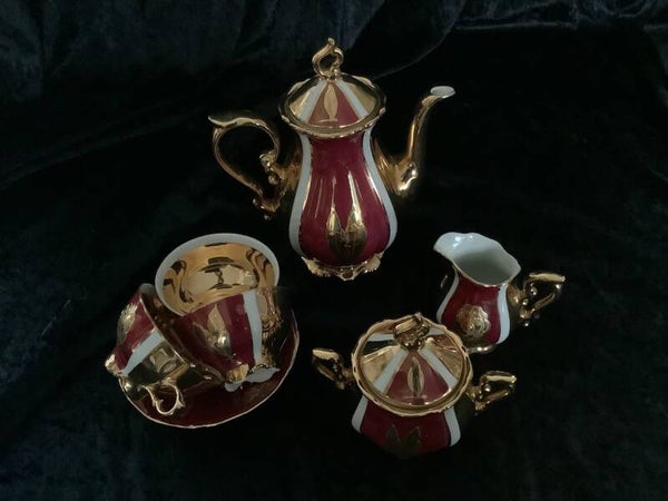 Op zoek naar iets unieks? Dit 11-delige Mocca servies van Bavaria Schaller Wiesau is een echte blikvanger. Het is versierd met bladgoud en heerlijk kitsch, perfect voor liefhebbers van retro en vintage spullen. Het servies is in perfecte staat, want het heeft altijd als decoratie gediend.