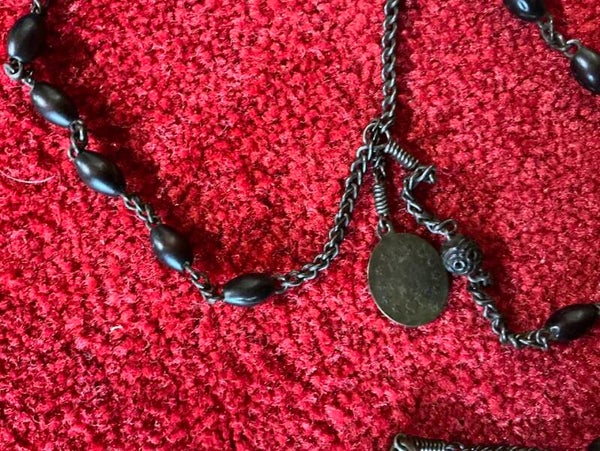 Een prachtige en zeer bijzondere rozenkrans uit Frankrijk, daterend uit de late jaren 1800. Op het kruis staat de inscriptie “Je Suis L’Immac Conception”, een verwijzing naar de Onbevlekte Ontvangenis. De rozenkrans is voorzien van een originele medaille en ademt de sfeer en devotie van zijn tijd.