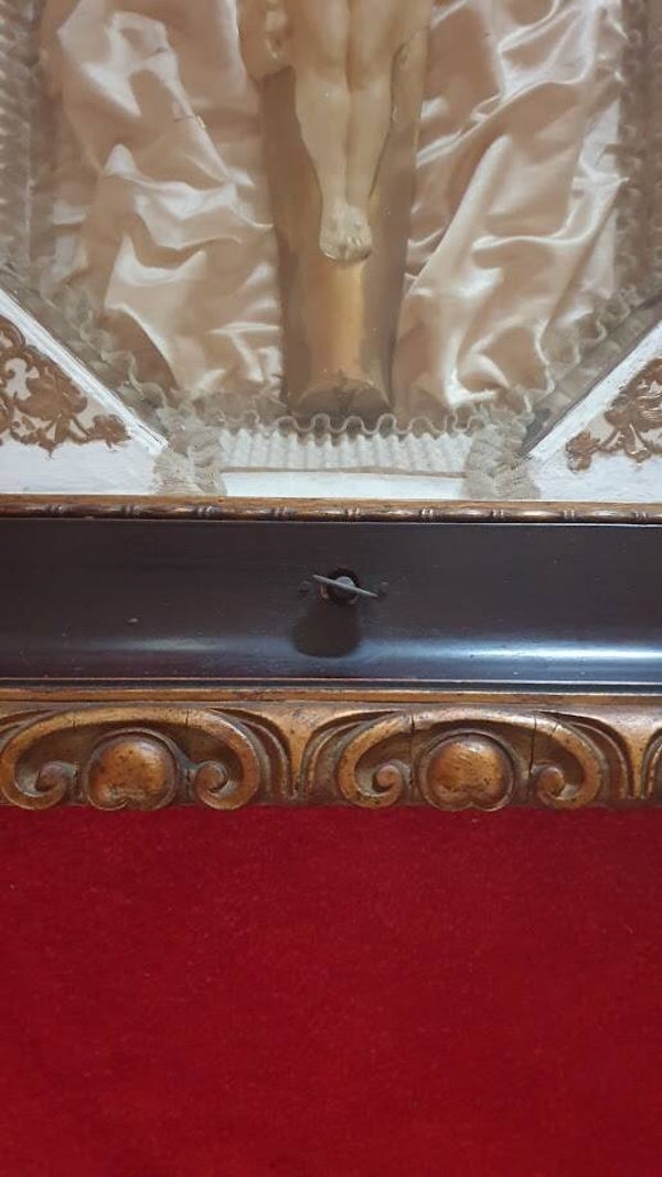 Uitvoering: kruisbeeld met corpus, muziekdoos in schilderijlijst