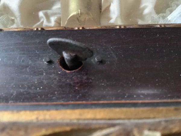 Met de sleutel (midden onder de lijst) kan de muziekdoos worden opgedraaid, waarna een sfeervol melodietje begint te spelen – een uniek detail dat dit stuk extra charme geeft.