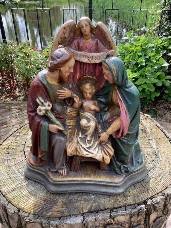 Een prachtig en zeldzaam gipsen heiligenbeeld, volledig puntgaaf. De kerstgroep toont Jozef, Maria en het kindje Jezus in de kribbe, met daarboven de engel Gloria in Excelsis Deo. Dit sfeervolle beeldje uit de jaren ’30 straalt warmte en devotie uit en is een echte blikvanger tijdens de feestdagen of als verzamelobject.