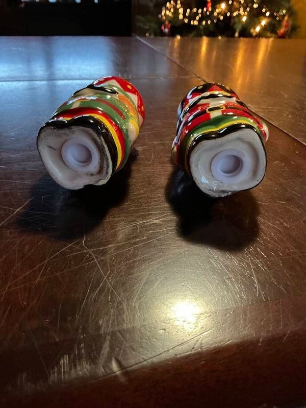 Een gezellig en vrolijk peper- en zoutstel in porselein/keramiek, volledig puntgaaf. Het setje toont notenkrakers en is perfect om je kersttafel of feestelijke gelegenheid mee op te vrolijken.