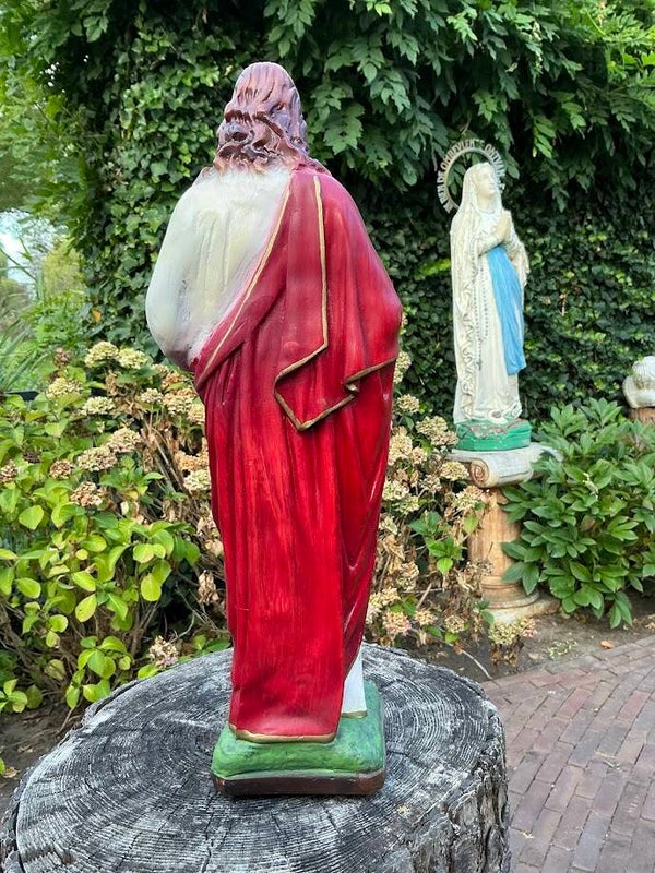 Een sfeervol en karaktervol religieus beeld, ideaal voor verzamelaars of als bijzondere eyecatcher in huis of tuin.