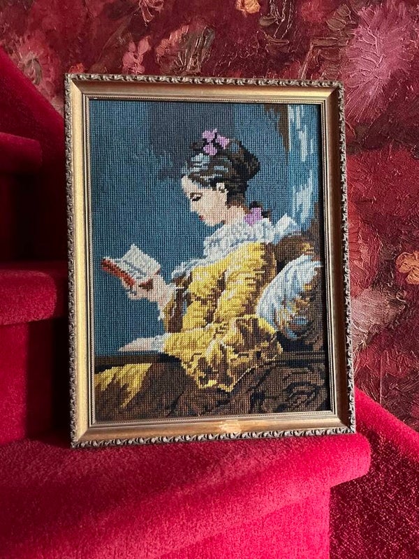 Prachtig en sfeervol handgeborduurd werk uit de jaren ’60/’70, voorstellende een meisje met een boek. Het kunstwerk is ingelijst in een sierlijke goudkleurige lijst, waardoor het een warme en klassieke uitstraling heeft.