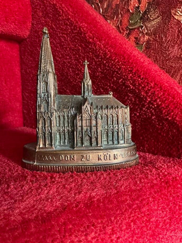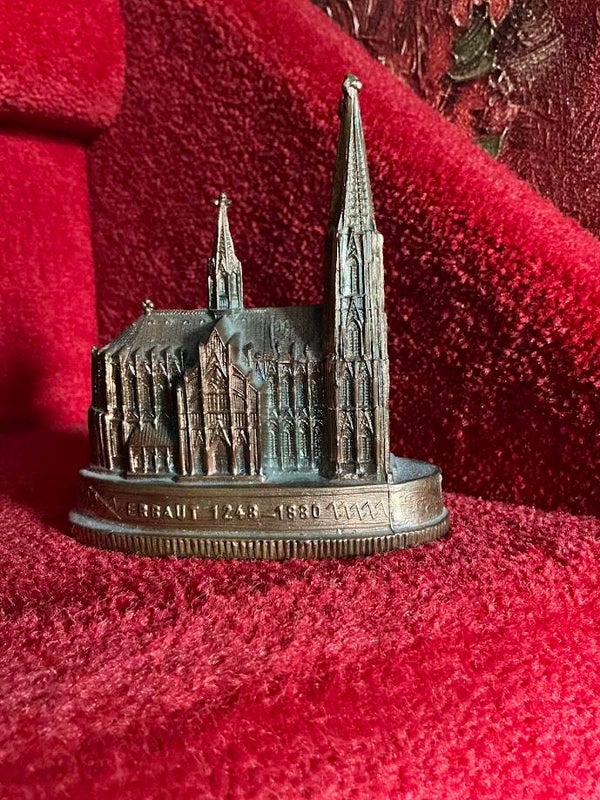 Bijzonder souvenir van de Dom van Keulen, uitgevoerd in koper/brons. Op de voorzijde staat de tekst “ERBAUT 1248 – 1880” en “DOM ZU KÖLN”. Een sfeervol en historisch object, ideaal voor verzamelaars van religieuze of toeristische memorabilia.