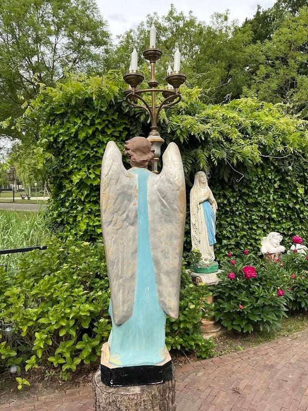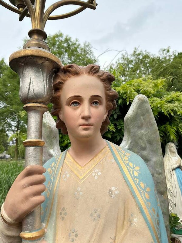 Een prachtige en zeldzame grote engel, afkomstig uit een kerk in Sainte-Hélène, Frankrijk. Dit indrukwekkende gipsen beeld, volledig puntgaaf, draagt een koperen kandelaar met 5 kaarsen en straalt een rustgevende devotie uit.