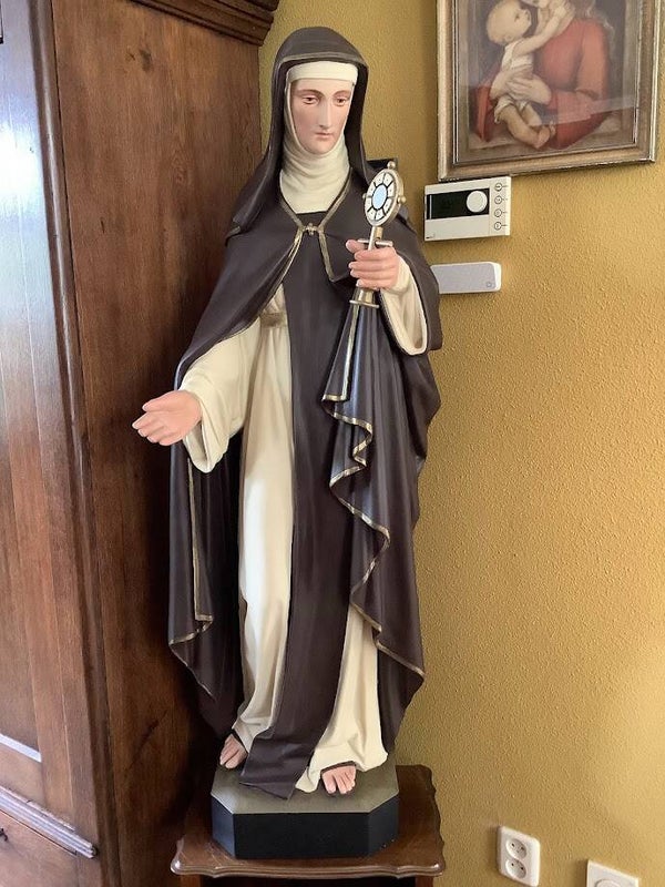 Een prachtig en zeldzaam heiligenbeeld van St. Clara, afkomstig uit België. Dit zware gipsen beeld uit de jaren ’30 verkeert in puntgave staat en heeft een serene, warme uitstraling – zie vooral het gezichtje, zo vol devotie.