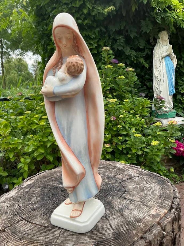 Een prachtig en zeldzaam porseleinen Mariabeeld uit de jaren ’50, vervaardigd door Goebel (W. Germany). Het beeld toont Maria met het kindje Jezus, met een zeer warme en liefdevolle uitstraling. Volledig puntgaaf en voorzien van merkteken H.M 35.