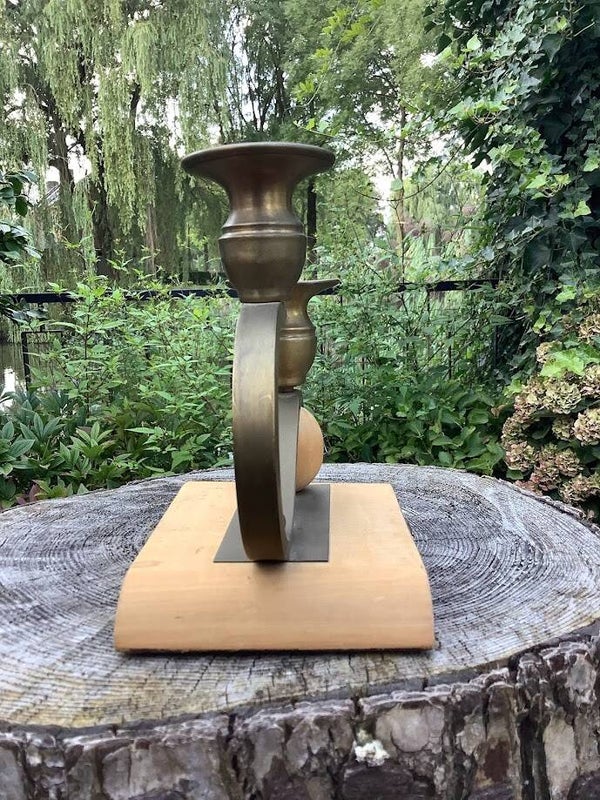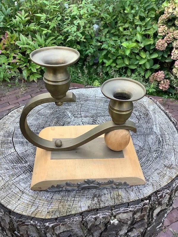 Leuke koperen kandelaar op houten voetstuk (jaren ’50)