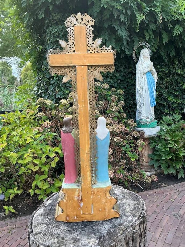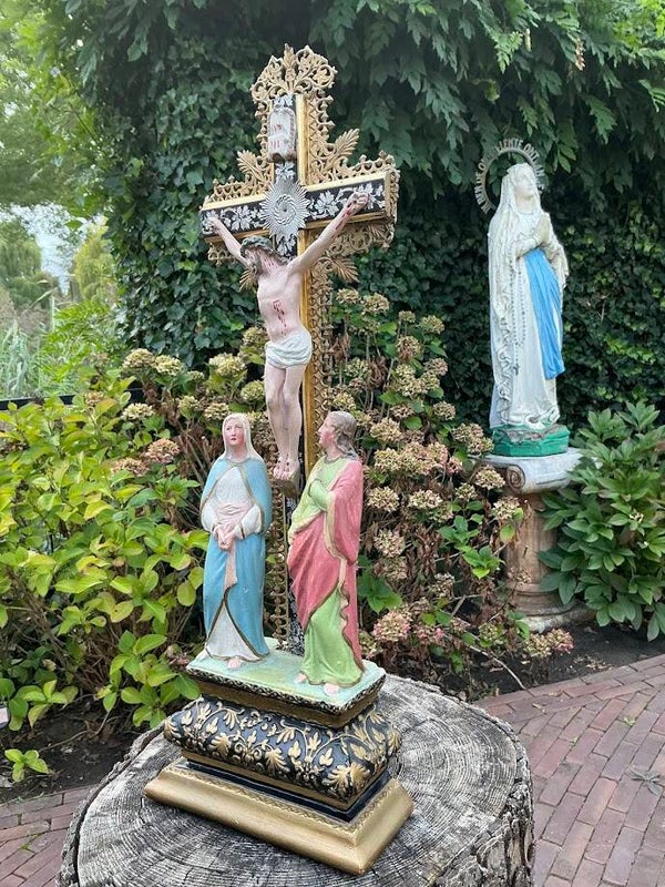 Het kruis is vervaardigd uit hout, rijkelijk beschilderd en versierd met verguld brons, terwijl de figuren in gips zijn uitgevoerd. Dit samenspel van materialen en details maakt het geheel tot een prachtig en verfijnd religieus kunstwerk.