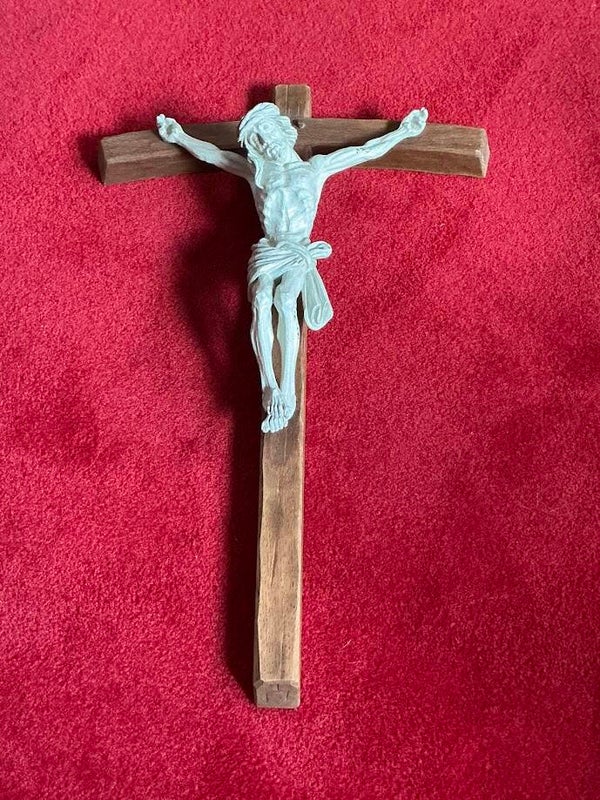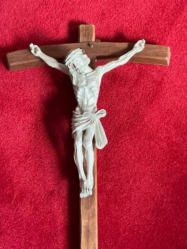 Een antiek en indrukwekkend Frans kruisbeeld uit de jaren ’40. Het kruis is uitgevoerd in hout, met daarop een fraai vormgegeven corpus van waarschijnlijk tin. De ingetogen combinatie van materialen geeft het stuk een sobere en devote uitstraling.