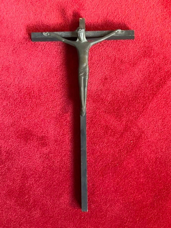 Een bijzonder en fraai antiek kruisbeeld, uitgevoerd in hout met een zorgvuldig vormgegeven corpus van waarschijnlijk brons. De combinatie van materialen geeft dit stuk een ingetogen maar krachtige uitstraling, met een verfijnde balans tussen devotie en ambacht.
