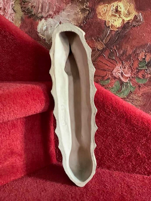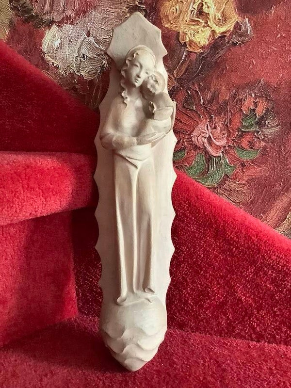 Een prachtig wandbeeld van Maria met het kindje Jezus, uitgevoerd in terracotta/gips. Het beeld verkeert in perfecte staat en is gesigneerd (binnenzijde). De warme kleurnuances geven het een zachte en devote uitstraling.