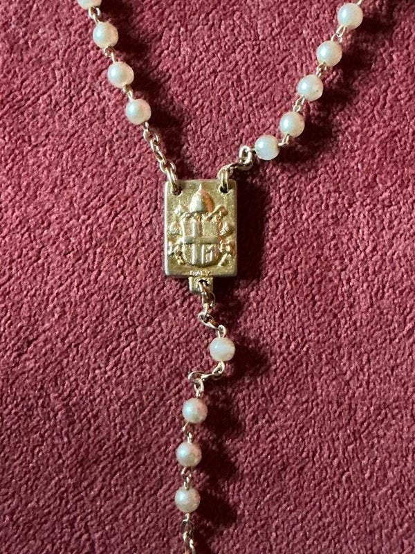 Een fraaie en bijzondere rozenkrans uit Italië, vervaardigd rond het jaar 2000. Het medaillon toont de afbeelding van paus Johannes Paulus II, terwijl de achterzijde het pauselijk wapen draagt. De rozenkrans is uitgevoerd in een goudkleurige afwerking met elegante parelmoer kraaltjes, en verkeert in goede staat.