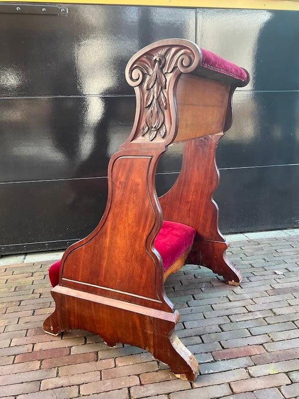 Een indrukwekkende en oude gebedsknielbank, ook wel kerk- of gebedsstoel, afkomstig van een pastoor uit een Belgische kerk. Deze royale XXL-knielbank is vervaardigd uit hout en bekleed met rijk bordeauxrood fluweel, wat het stuk een statige en sacrale uitstraling geeft.