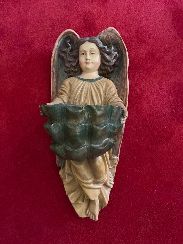 Een indrukwekkend XL wijwatervat in de vorm van een engel, uitgevoerd als wandbeeld. Dit bijzondere stuk uit de jaren ’70 is vervaardigd uit polyester en hout en verkeert in prachtige gave staat. De engel houdt het wijwatervat met serene waardigheid, waardoor het beeld zowel kracht als devotie uitstraalt.