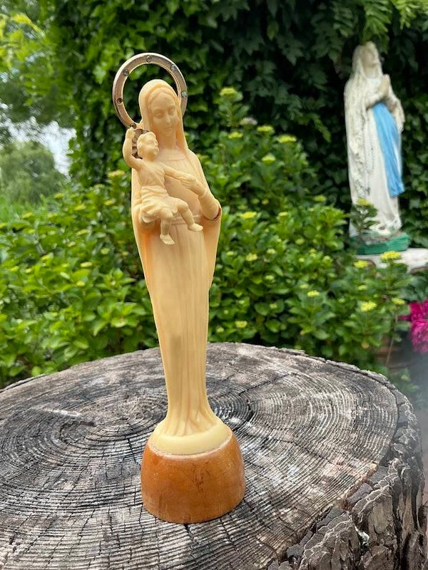 Een prachtig en puntgaaf Mariabeeldje met het kindje Jezus, daterend uit de jaren ’50/’60. Het beeldje is vervaardigd uit polyester en geplaatst op een houten voetstuk, wat het geheel een warme en sierlijke uitstraling geeft.