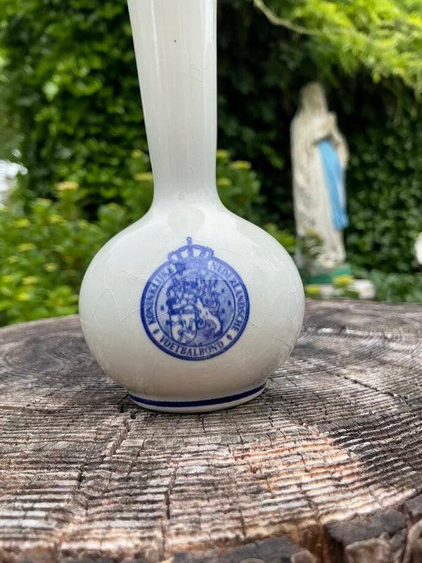 Een mooi Delfts blauw vaasje, voorzien van het logo van de Koninklijke Nederlandse Voetbalbond (KNVB). Het vaasje verkeert in puntgave staat en combineert traditioneel Hollands keramiek met sportieve symboliek.