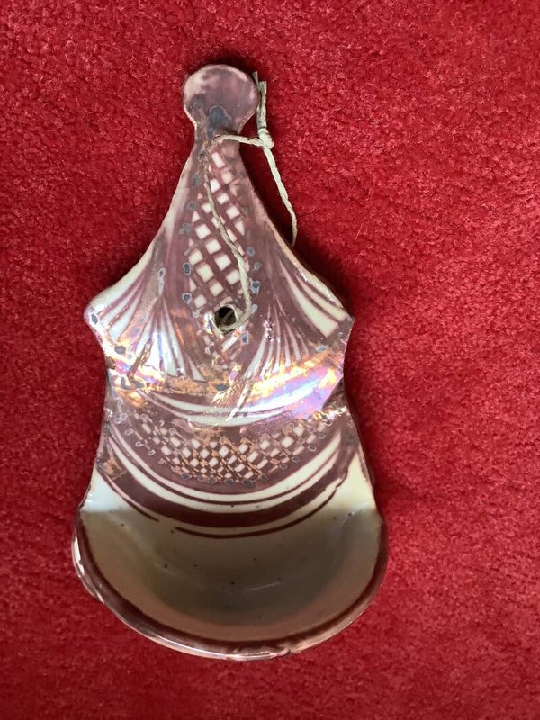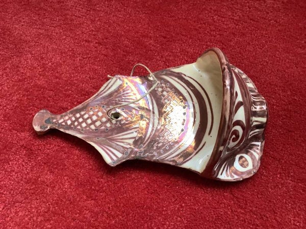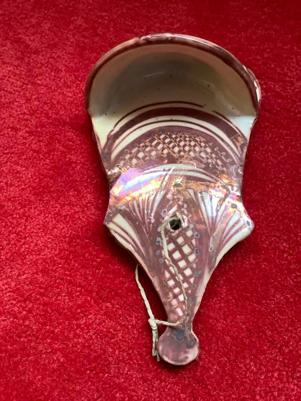 Een prachtig wijwatervat van puntgaaf keramiek, afkomstig uit Sevilla. Het bakje is uitgevoerd met een subtiele parelmoer glans, die het een elegante en bijzondere uitstraling geeft.