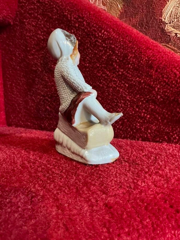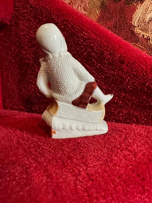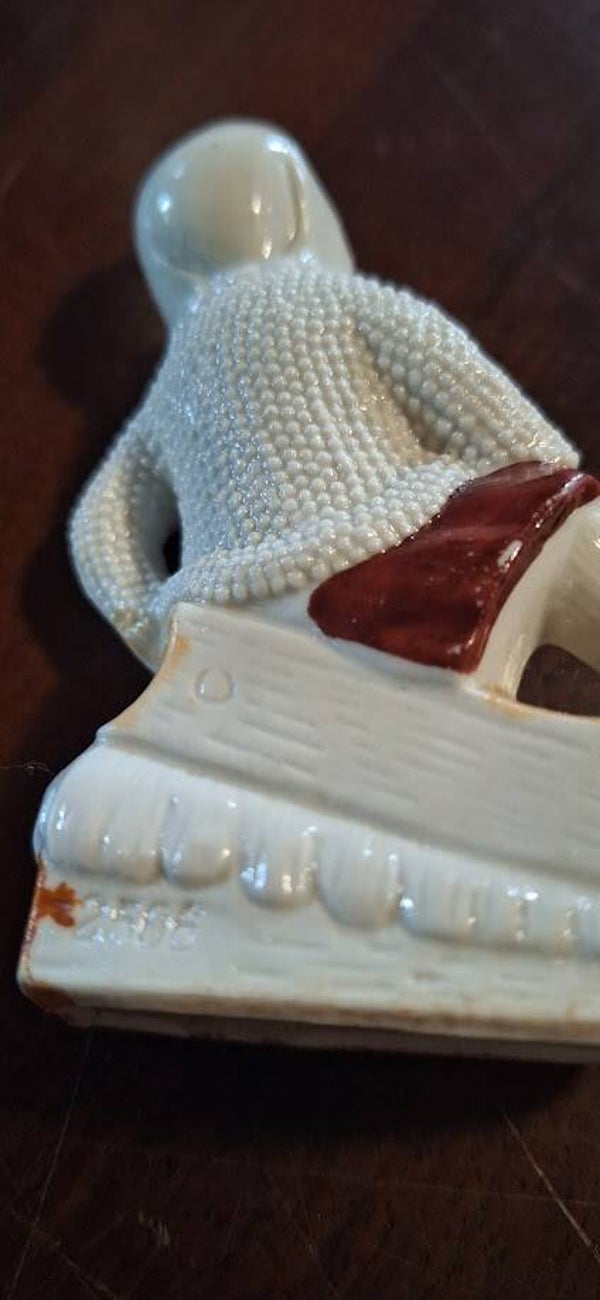 Zeer verfijnd antiek porseleinen bisque beeldje uit de jaren 1920/1930. Het beeldje toont een meisje op een slee in de sneeuw en is met zorg en detail vervaardigd. Dit unieke stuk is gemerkt met nummer 2506 en verkeert in puntgave staat. Een prachtig voorbeeld van vroege 20e-eeuwse porseleinkunst, ideaal voor verzamelaars van antiek en bisque beeldjes.