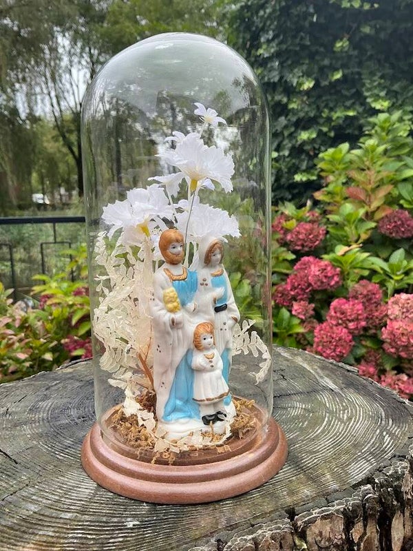 Mooi porseleinen heiligenbeeld van de Heilige Familie, daterend uit de jaren ’70. Dit religieuze beeld wordt geleverd inclusief stolp, gemaakt van stevig kunststof waardoor het eenvoudig en veilig te verzenden is. De stolp geeft het beeld bovendien een stijlvolle en beschermende uitstraling, ideaal voor in huis, een bidhoek of als verzamelobject.