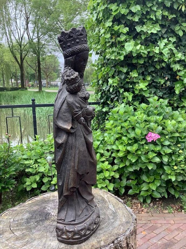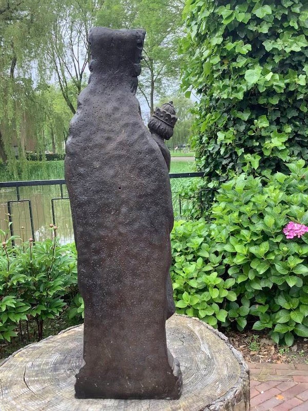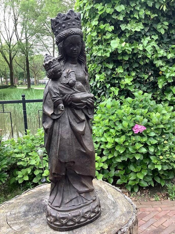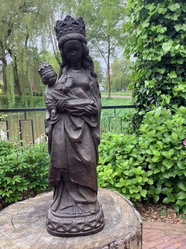 en bijzonder en zeldzaam antiek Mariabeeld, voorstellende Onze Lieve Vrouw in het Zand uit Roermond. Dit indrukwekkende beeld is vervaardigd uit zwaar massief gips en straalt kracht, eenvoud en devotie uit.