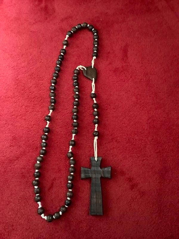 De rozenkrans is dubbel gemeten en heeft een lengte van 82 cm, waardoor hij opvallend groot en indrukwekkend is. Het bijbehorende houten kruis meet 13 cm en vormt het hart van dit betekenisvolle religieuze symbool.