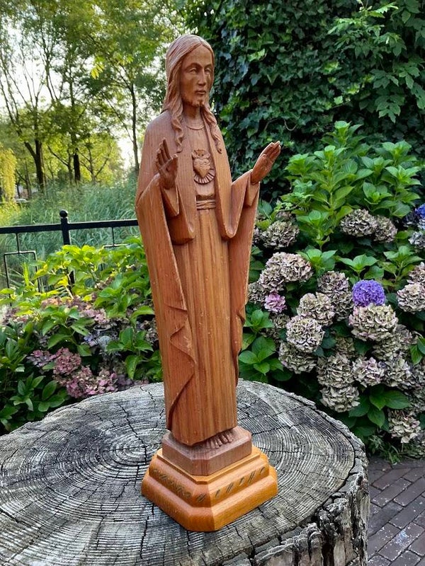 Een bijzonder houten Jezusbeeld met het Heilig Hart, perfect voor verzamelaars van religieuze kunst, liefhebbers van vintage interieurstukken of als spiritueel geschenk.