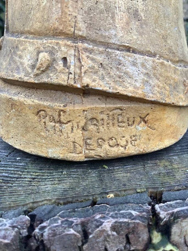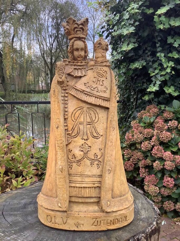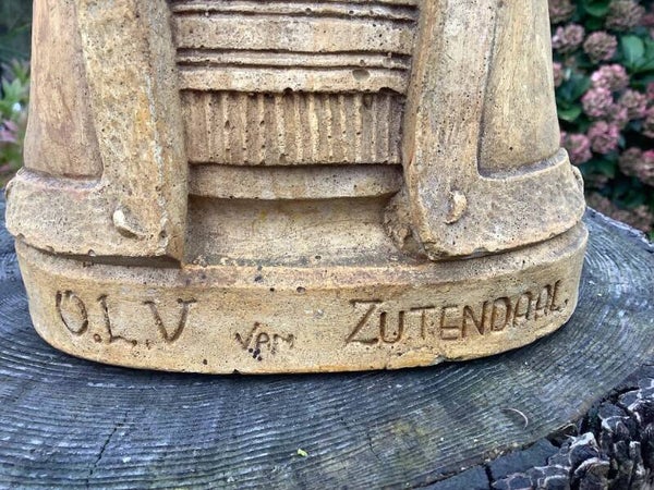 Dit prachtige antieke Mariabeeld van Onze-Lieve-Vrouw van Zutendaal is een zeldzaam en verfijnd religieus kunstwerk uit de jaren ’20. Het beeld is vervaardigd uit gips en zorgvuldig gesigneerd (linksonder), wat de authenticiteit en historische waarde onderstreept.
