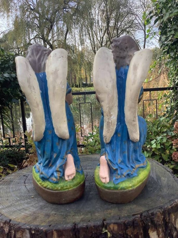 De beelden tonen twee devoot knielende engelen, fraai vormgegeven met zachte gelaatstrekken en sierlijke vleugels. Dankzij hun warme patina en authentieke afwerking brengen ze een vleugje nostalgie en rust in elk interieur. Perfect als decoratief duo voor de kerstperiode of als spirituele eyecatcher het hele jaar door.