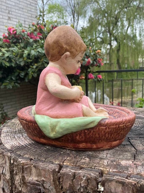Vintage Kraamcadeau – Gipsen Beeldje uit de Jaren ’60 (Meisje in Mand)