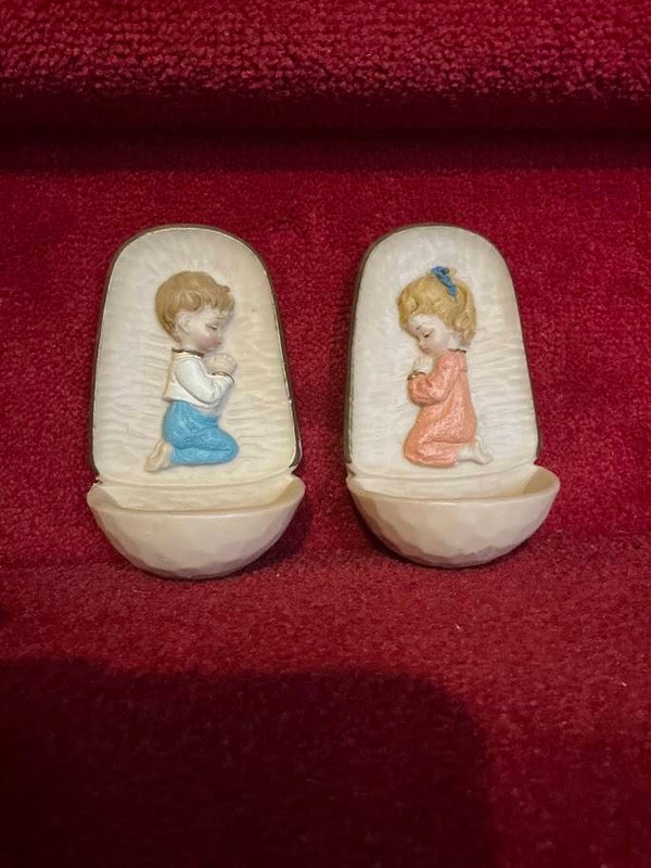 Breng een vleugje nostalgie in huis met deze prachtige vintage set wijwatervaatjes uit de jaren 50/60. De set bestaat uit een liefelijk jongetje en meisje, beide met zorg vormgegeven en in puntgave staat.