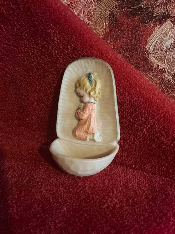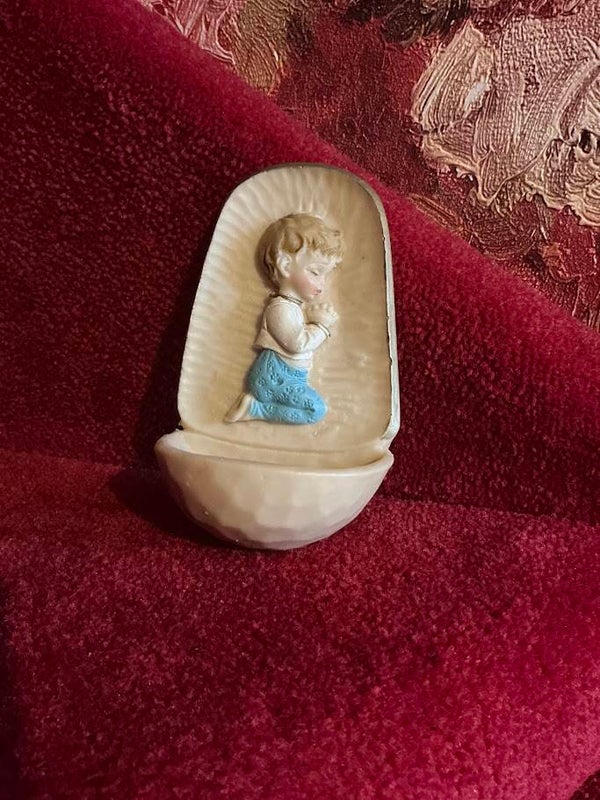 Deze unieke wijwaterset is niet alleen een bijzonder decoratief item, maar ook een waardevol stukje katholiek erfgoed uit de vorige eeuw. Ideaal voor verzamelaars of als sfeervol accent in een retro of landelijk interieur.