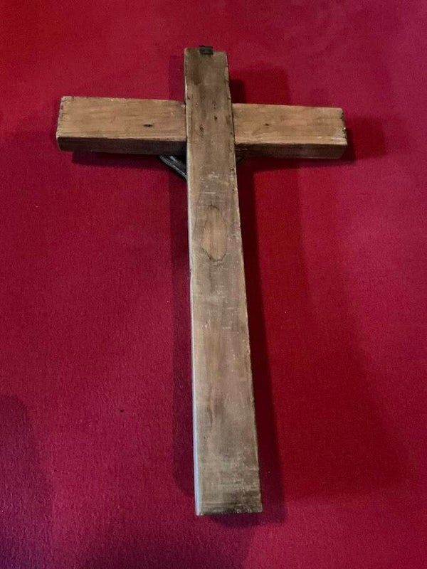 Dit authentieke Belgische kruisbeeld uit de jaren ’30 tot ’50 is een prachtig religieus erfstuk dat zowel qua uitstraling als vakmanschap indruk maakt. Het kruis is vervaardigd uit massief hout en voorzien van een gedetailleerd corpus in tin. De warme houttinten en het zilverachtige corpus zorgen voor een stijlvol contrast dat past in zowel klassieke als spirituele interieurs.
