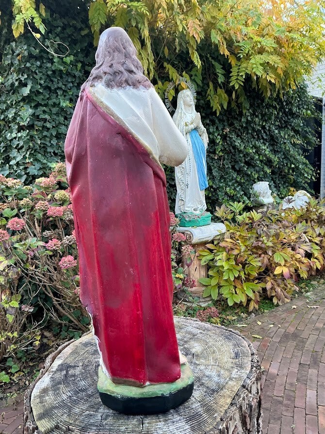 Een prachtig antiek Frans standbeeld van Jezus met het Heilig Hart, afkomstig uit Lisieux, Frankrijk. Dit beeld dateert uit de jaren 20/30 en is vervaardigd uit gips. De uitdrukking van Jezus is zacht en vredig, met subtiele kleurnuances die het beeld een warme, devotionele uitstraling geven.