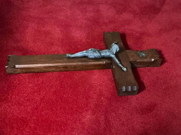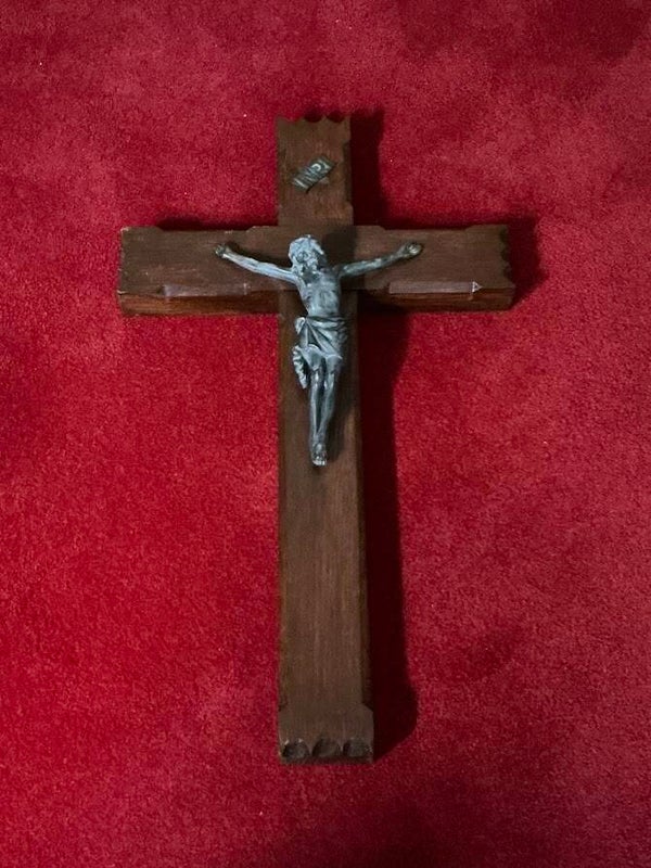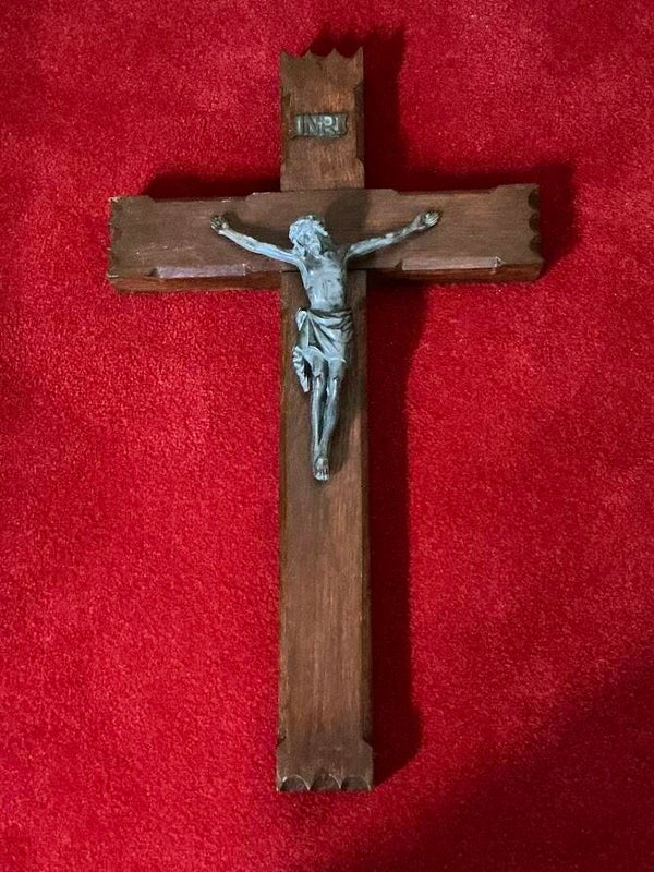 Een prachtig groot antiek kruisbeeld, afkomstig uit een kloosterkapel in de Franse Ardennen. Dit indrukwekkende kruisbeeld dateert uit de jaren 20/30 en is uitgevoerd in massief hout met een tinnen corpus van Jezus Christus.