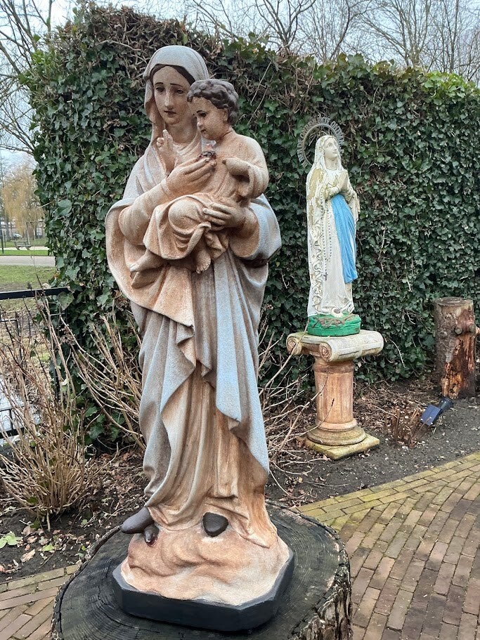 Dankzij het royale formaat en de mooie proporties is dit beeld een echte blikvanger. De serene uitstraling van Maria met het kindje Jezus maakt het tot een betekenisvol religieus object, zeer geschikt voor verzamelaars van heiligenbeelden of als spiritueel accent in huis.