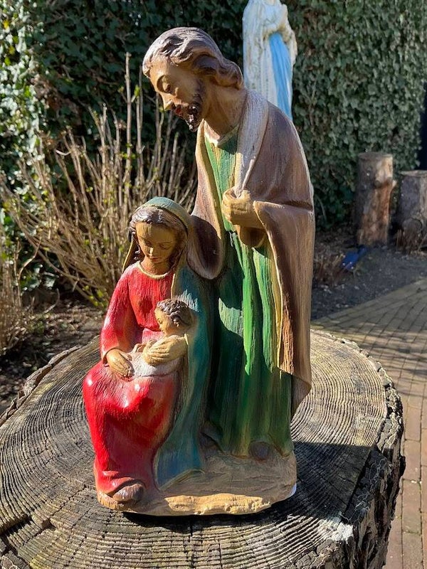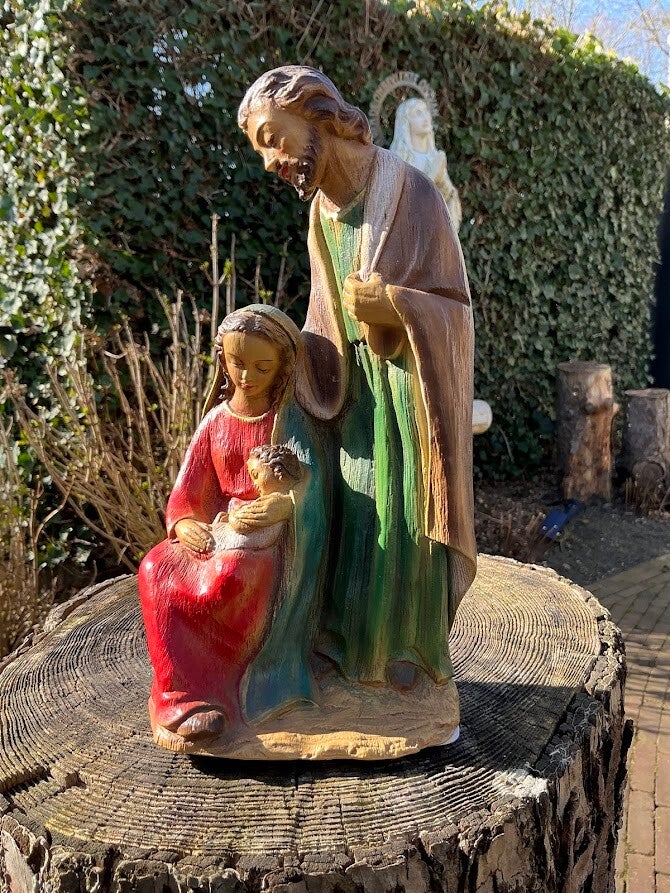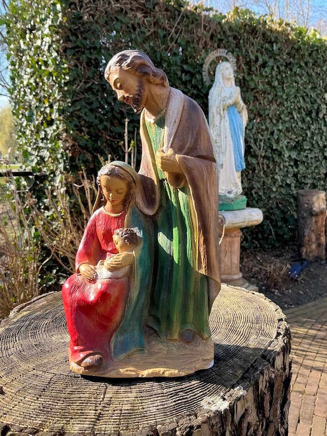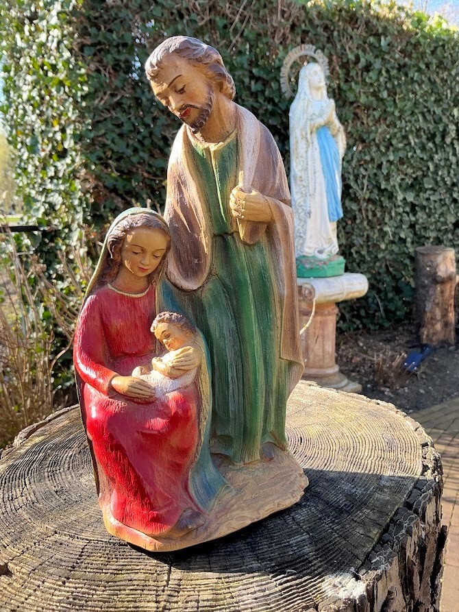 Dit prachtige heiligenbeeld van de Heilige Familie uit de jaren ’60 toont Jozef van Nazareth, Maria en het Jezus in een liefdevolle en serene voorstelling. Het beeld straalt warmte en verbondenheid uit en past perfect binnen een religieuze of sfeervolle kerstdecoratie.