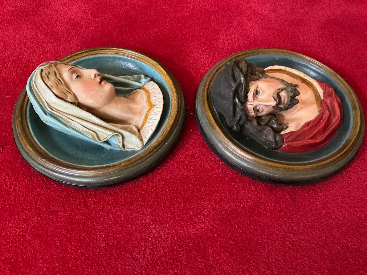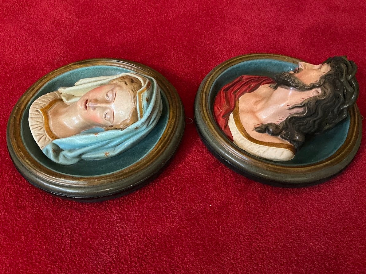 Beide beelden verkeren in gave staat en zijn voorzien van stevige ophanghaken, zodat ze direct een bijzondere plek aan de muur kunnen krijgen. Een uniek paar voor verzamelaars van religieuze kunst, devotionalia of voor wie op zoek is naar een historisch en spiritueel object met karakter.