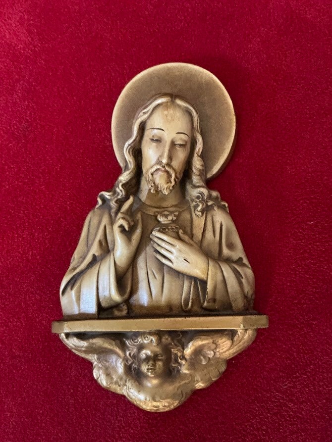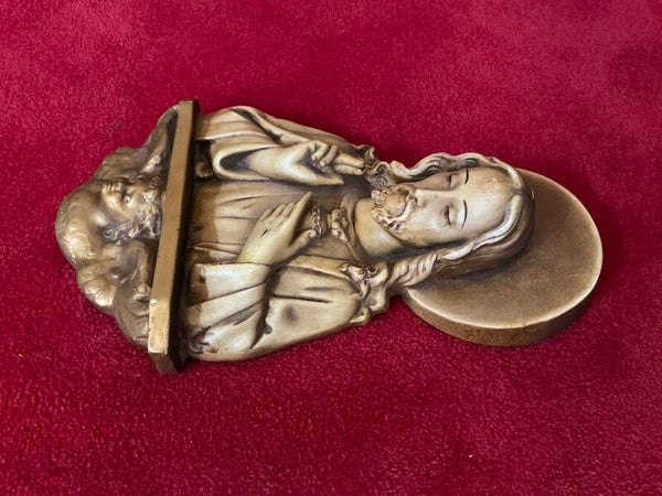 Dit zeldzame en indrukwekkende antieke muurbeeld van Jezus met een engel is afkomstig uit de Franse Ardennen en dateert uit de jaren ’20–’30. Het beeld is vervaardigd uit zwaar gips en heeft een prachtige, karaktervolle uitstraling.