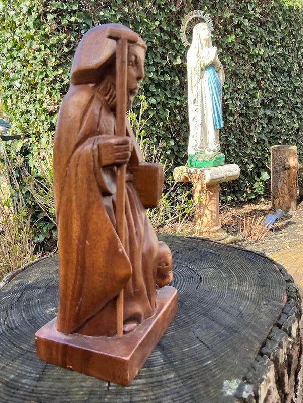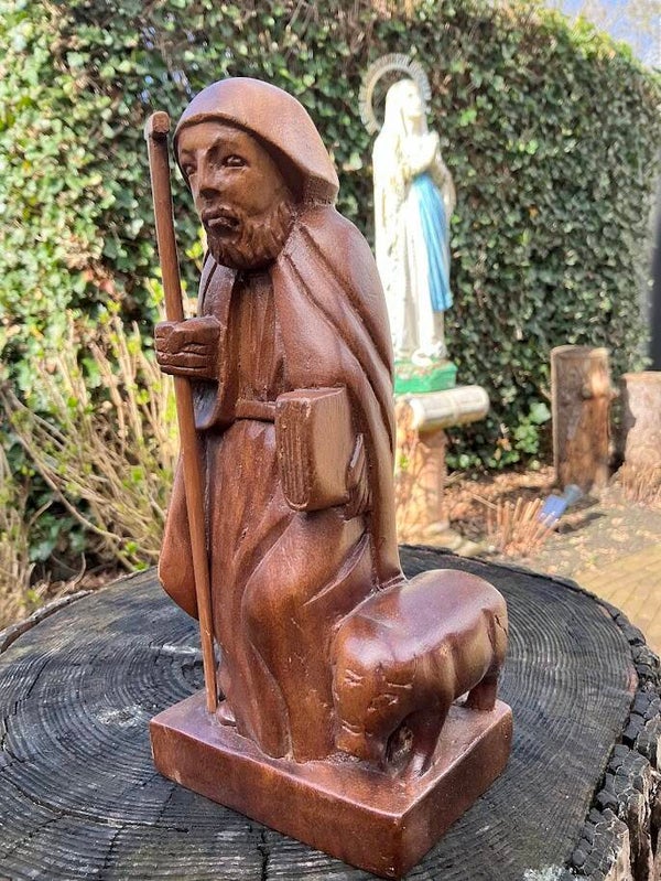 Een karaktervol en historisch heiligenbeeld met een sterke symbolische betekenis.