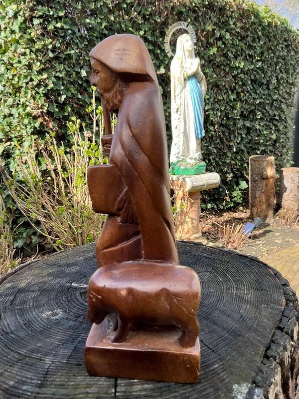 Het beeld is uitgevoerd in gedetailleerd houtsnijwerk en heeft een warme, authentieke uitstraling. Dankzij de mooie afwerking en het compacte formaat is het een bijzonder verzamelobject voor liefhebbers van religieuze kunst en antieke heiligenbeelden.