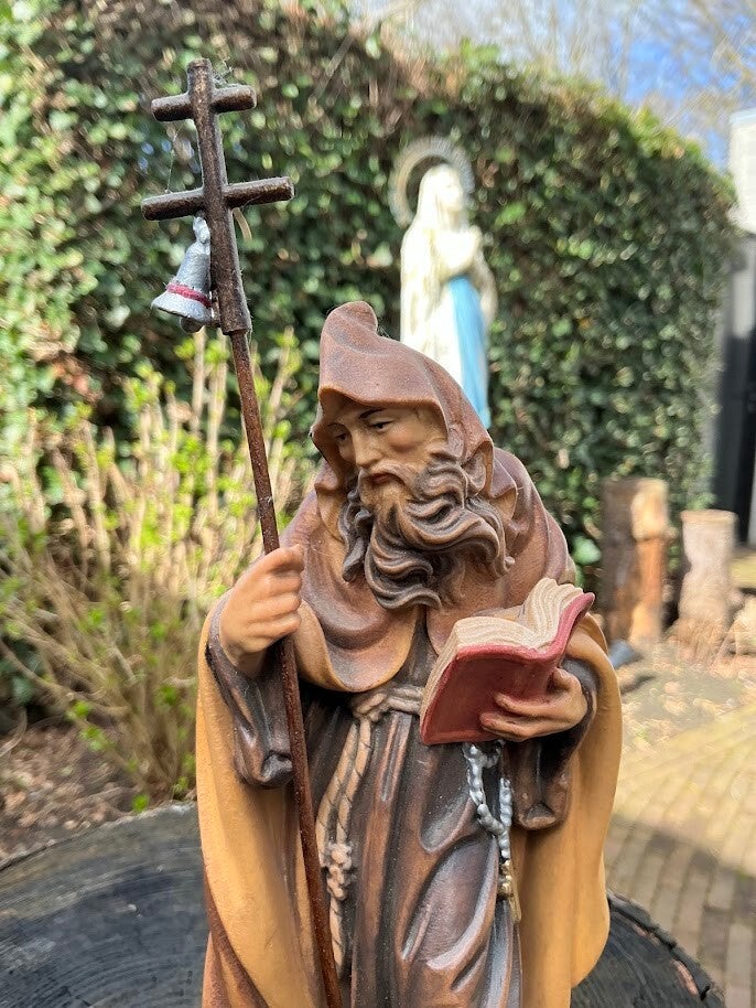 Een karaktervol en uniek heiligenbeeld, perfect voor liefhebbers van religieuze kunst en ambachtelijk houtsnijwerk.