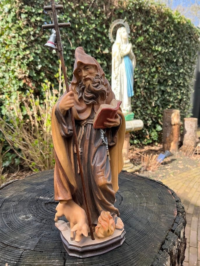 Dit prachtige en puntgave handgesneden heiligenbeeld van Antonius Abt toont de heilige samen met zijn kenmerkende attribuut: het varken aan zijn zijde. Het beeld is vervaardigd uit esdoornhout en met de hand beschilderd, wat zorgt voor een warme en authentieke uitstraling.