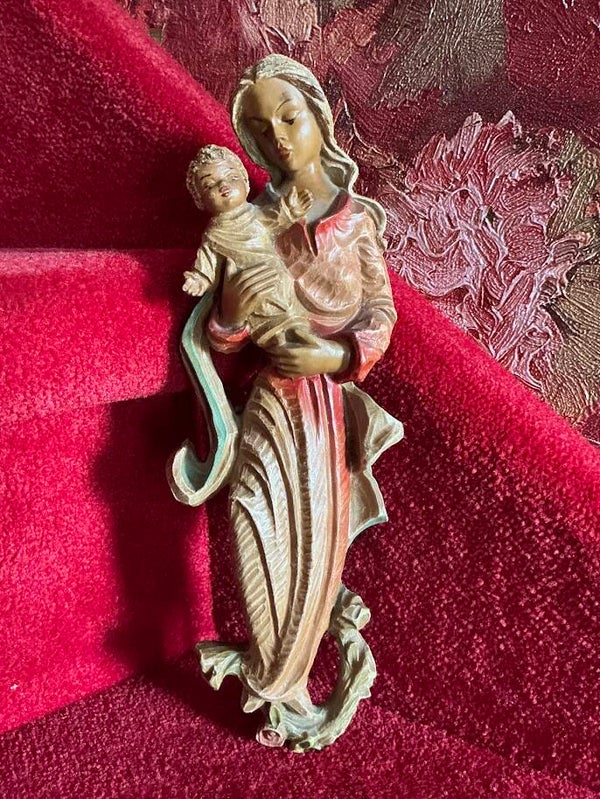 Lief vintage Mariabeeld met kindje – muurbeeld (jaren ’60)