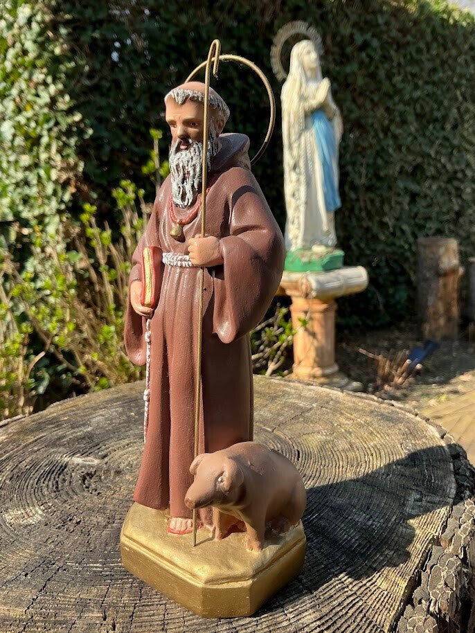 Dit prachtige en puntgave heiligenbeeld van Antonius Abt toont de heilige met zijn klassieke attributen: het varken, een aureool en staf. Het beeld dateert uit de jaren ’50 en is vervaardigd uit gips.