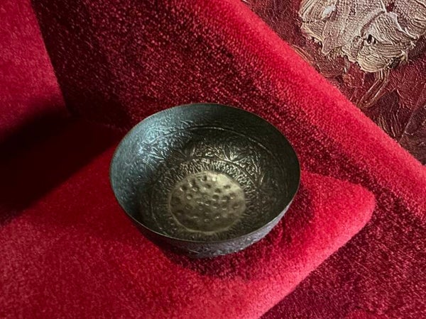 Deze prachtige antieke kom is vervaardigd uit een legering en rijkelijk versierd met de verfijnde niëllotechniek, een traditionele decoratiemethode waarbij donkere inleg wordt gebruikt om fijne patronen te accentueren. Het stuk dateert uit de 19e eeuw en is vermoedelijk afkomstig uit Thailand of India.