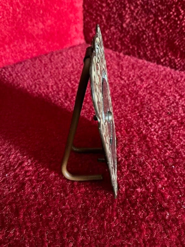 De kalender is vervaardigd uit koper en rijkelijk bewerkt met fijne, gedetailleerde patronen, wat zorgt voor een elegante en klassieke uitstraling. Dankzij de draaischijven kunnen eenvoudig de juiste dag en maand worden ingesteld, waardoor deze kalender jaar na jaar gebruikt kan worden.