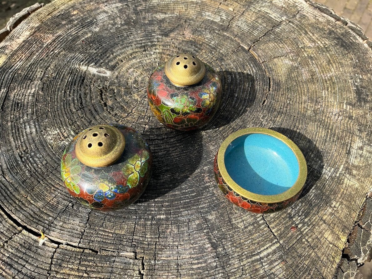 Deze prachtige set, bestaande uit een zoutvaatje, pepervaatje en bijpassend schaaltje, is vervaardigd met de traditionele cloisonnétechniek. Bij deze verfijnde techniek wordt emaille zorgvuldig aangebracht in kleine compartimenten, gevormd door dunne metalen draden (vaak koper of brons), wat zorgt voor een rijk en gedetailleerd decor.