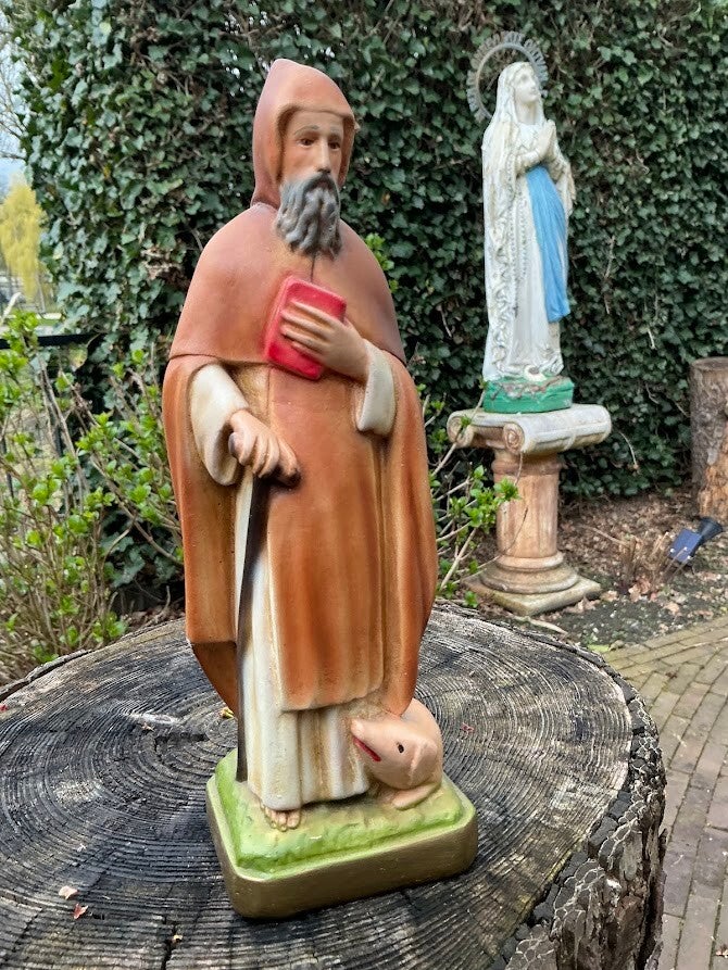 Dit mooie oude heiligenbeeld van Antonius Abt toont de heilige met zijn kenmerkende attribuut: het varken aan zijn voeten. Het beeld is vervaardigd uit gips en dateert uit de jaren ’60.